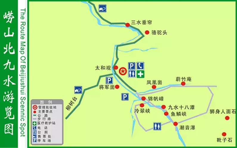 北九水位于青島嶗山白沙河上游。白沙河源出山頂北麓,河水經(jīng)山腳而折流,有九折;人行河畔小路,轉(zhuǎn)折處須涉水而過,亦九涉;每涉一次為一水,故稱九水。九水又分內(nèi)九水、外九水(即北九水)和南九水三路,其中以北九水的景觀最為著名。